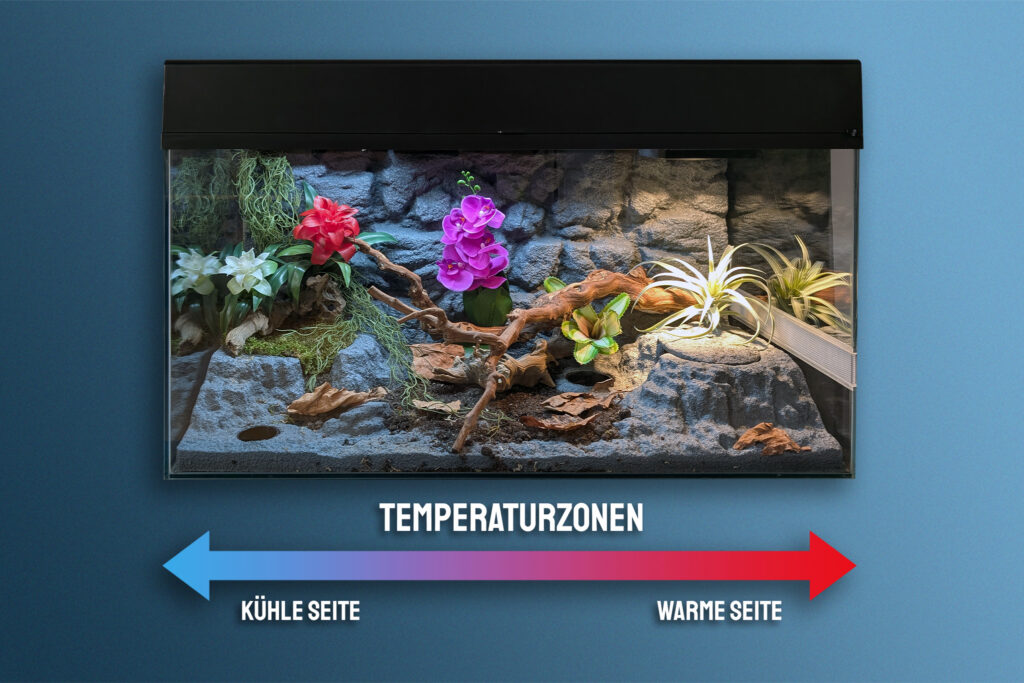 - Nicht überall heizen: Lassen Sie einen Teil des Terrariums unbeheizt, um kühlere Rückzugsorte zu schaffen.