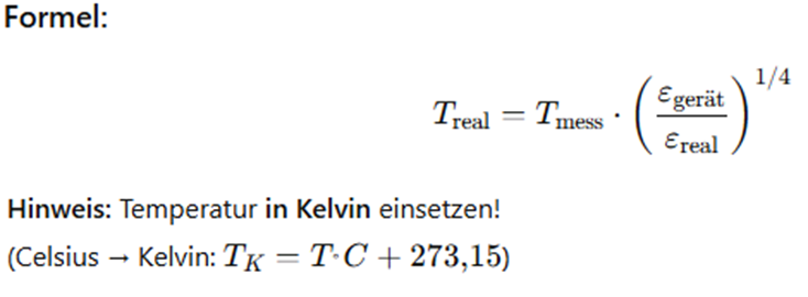 Sollten Sie ein einfaches Handpyrometer verwenden, dass es nicht erlaubt, den Emissionsgrad manuell zu ändern, dann können sie folgende Formel zu Abschätzung der wahren Temperatur verwenden.